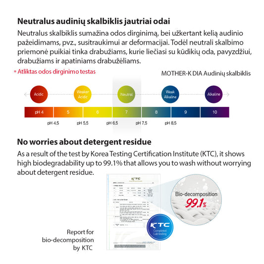 Mother-K audinių priežiūros priemonės – tai kruopščiai sukurti produktai, skirti saugiai ir švelniai skalbti kūdikių ir vaikų drabužėlius. Be kenksmingų medžiagų, dirginančių kvapų ar stiprių cheminių ingredientų – tik švarūs, augalinės kilmės komponentai, tinkami net jautriausiai odai.